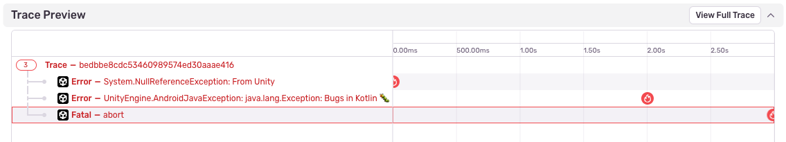 On the issues details page, you will see this as errors being connected within the Trace Preview. The example below is taken from an game running on Android and shows a C# error being connected to an exception in Kotlin and a crash in C.