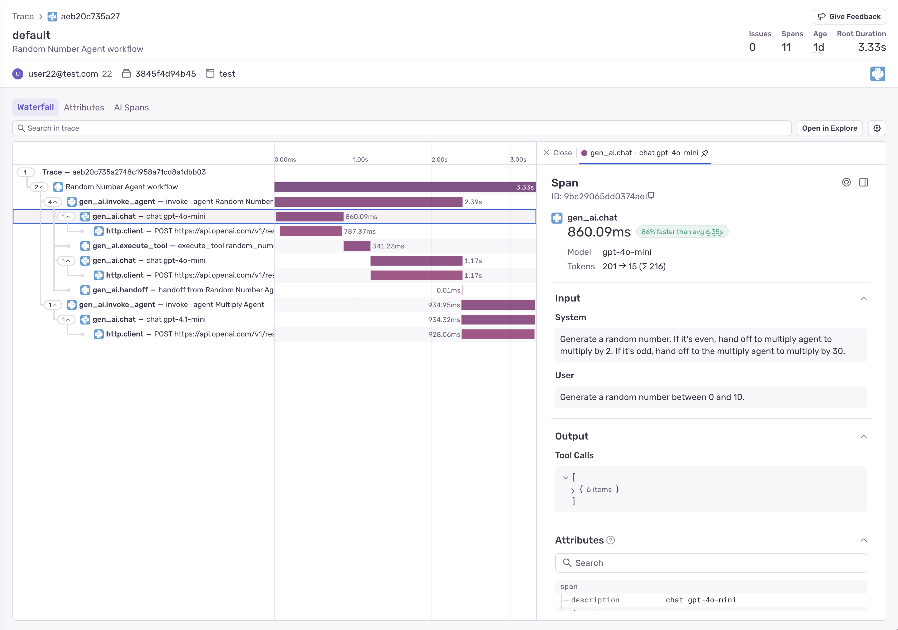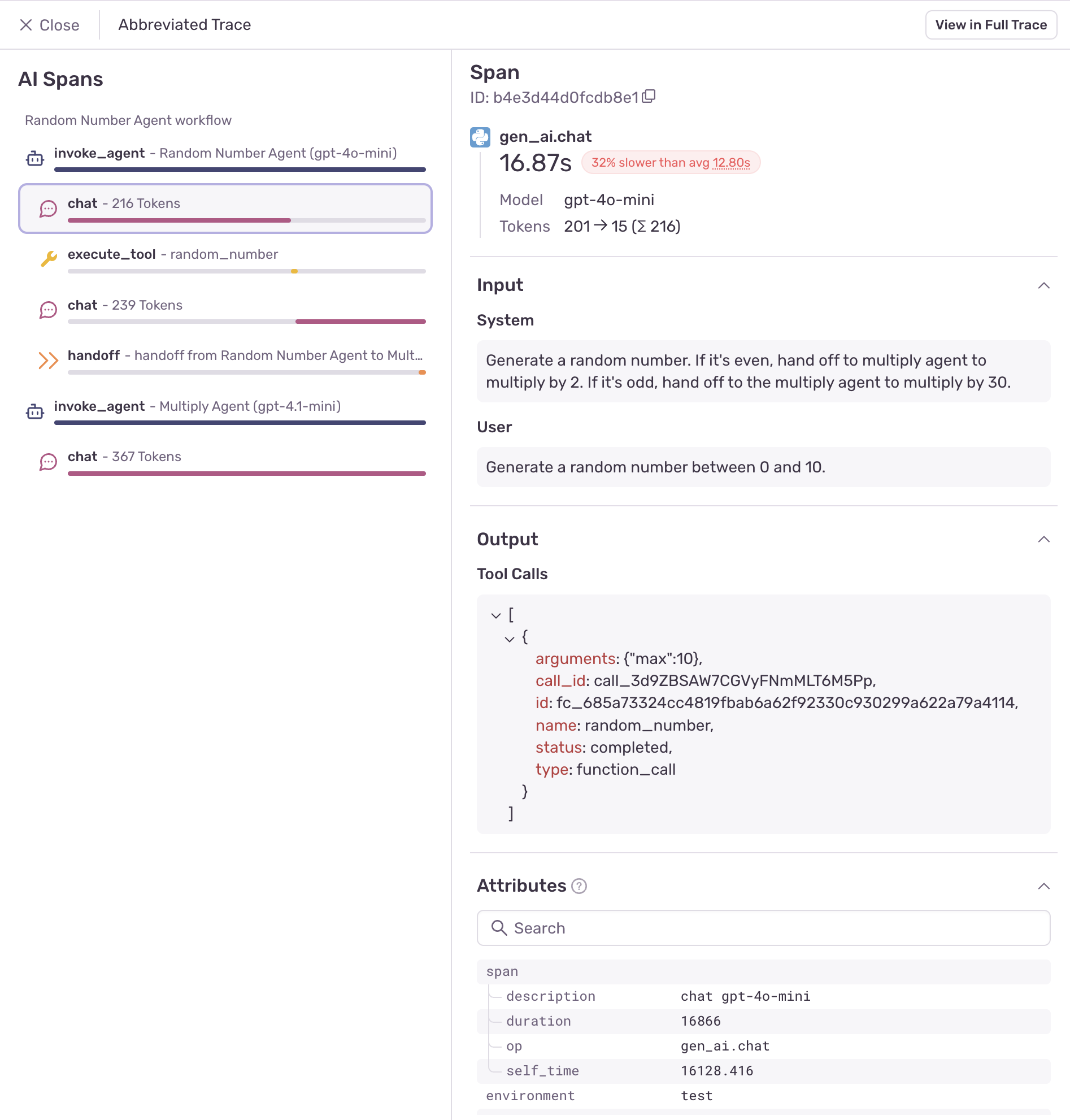 When your AI agents are part of larger applications (like web servers or APIs), the trace view will include context from other Sentry integrations, giving you a complete picture of how your agents fit into your overall application architecture.