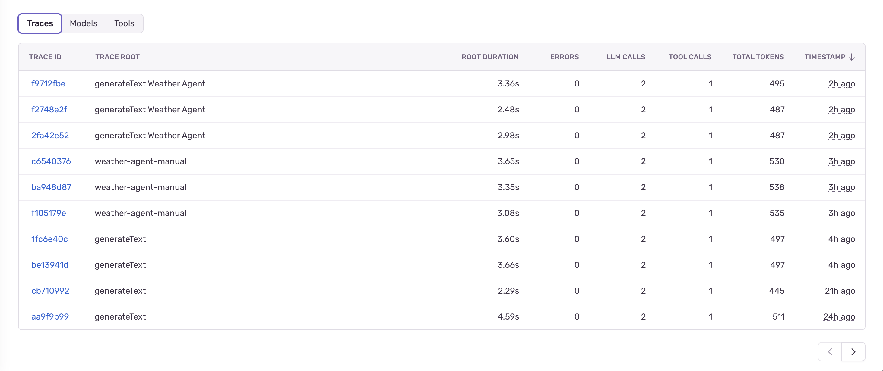 • Traces: Recent agent runs with duration, errors, number of LLM and tool calls and token usage
